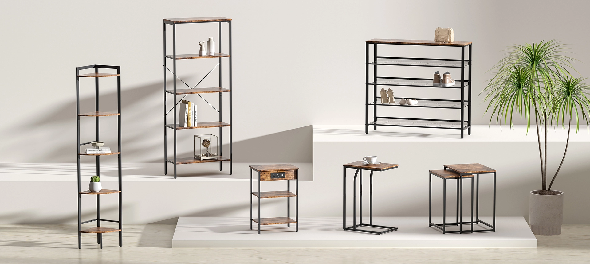 涵盖挂衣架、玄关桌、边桌、茶几、电视柜、置物架。