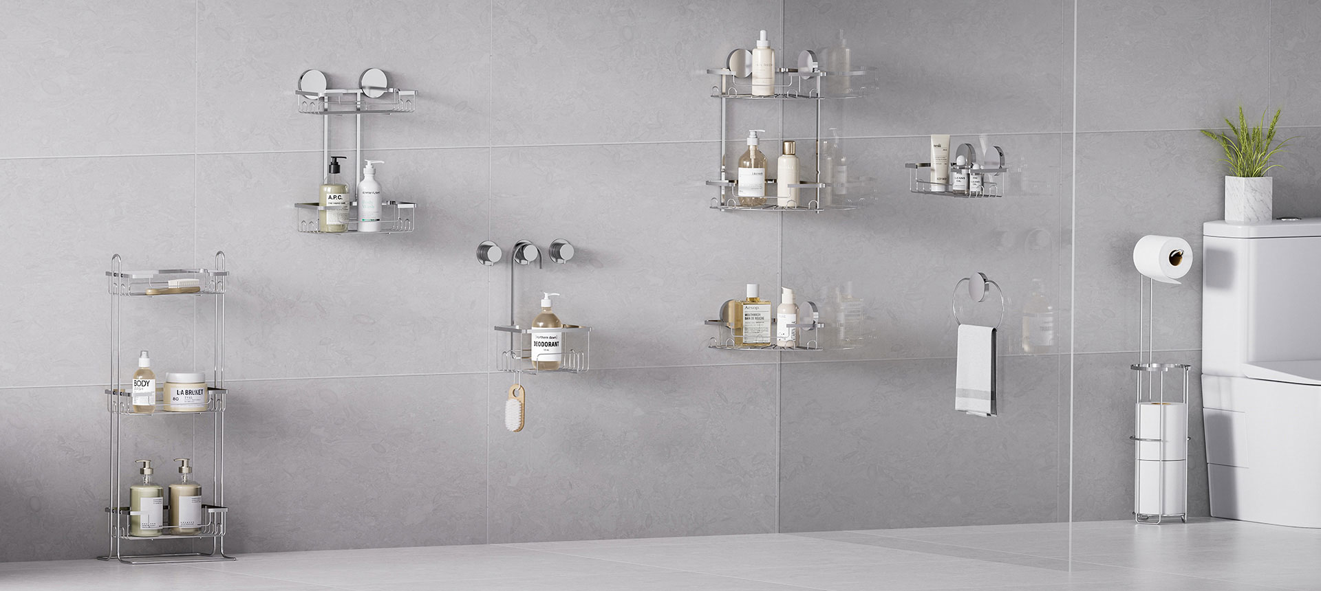 涵盖花洒架、角落架、皂架、毛巾杆、纸巾架、挂钩。